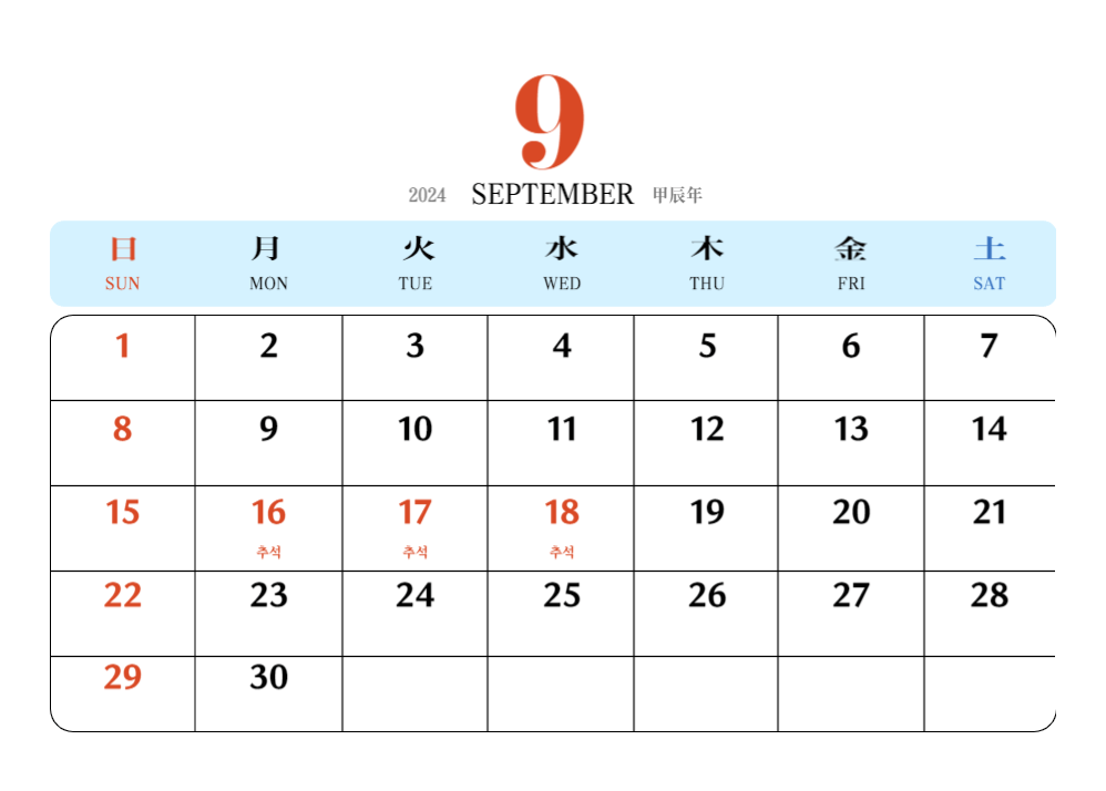 ◆ 2024년 9월 공휴일은 추석 연휴로 14일(토)부터 18일(수)까지 5일 연휴입니다. 19일(목), 20일(금) 휴가가 가능하다면 최대 9일 연휴를 보낼 수 있습니다. 추석연휴에 해외여행이나 장거리 여행을 계획하시는 분들에게 딱 좋은 일정입니다.