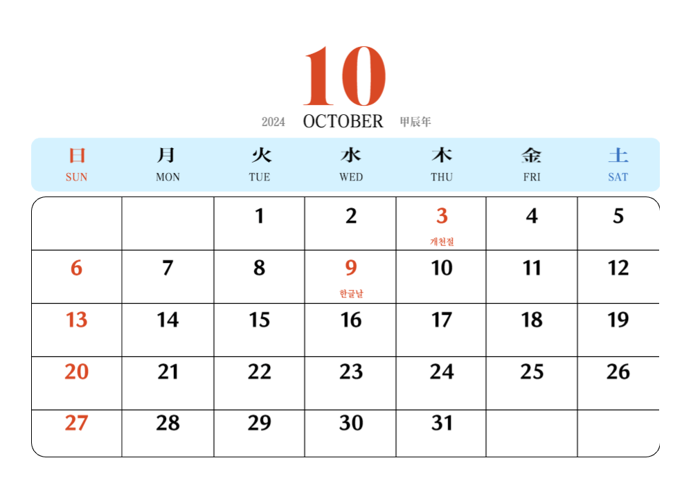 ◆ 2024년 10월 공휴일은 3일(목) 개천절, 9일(수) 한글날입니다. 4일(금) 휴가 사용 시 4일 휴일을 보낼 수 있습니다.