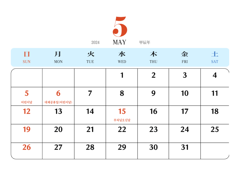 ◆ 2024년 5월 공휴일은 5일 어린이날과 15일 부처님 오신 날입니다. 어린이날을 맞이하여 4일(토)부터 6일(월)까지 3일 연휴로 여유로운 어린이 주간을 맞이할 수 있습니다. 또한 5월 1일은 근로자의 날이라 근로자 대부분이 5월 1일 휴일을 보낼 수 있어 2일 근무 후 3일 연휴를 맞이 할 수 있습니다.