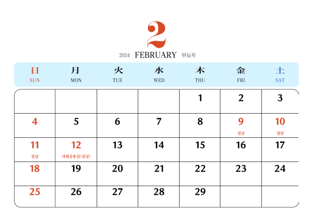 ◆ 2024년 2월 공휴일은 설날 연휴로 12일이 대체공휴일로 4일의 설날 연휴를 보낼 수 있습니다.