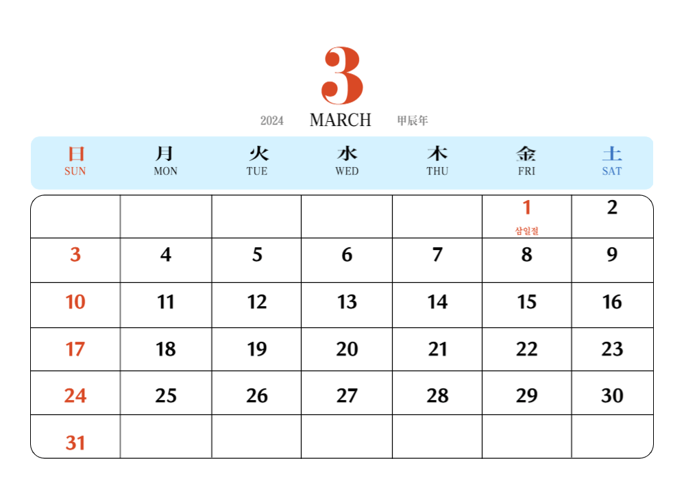 ◆ 2024년 3월 공휴일은 3월 1일 삼일절입니다. 2023년 3월 3일이 자녀분들 개학이라 방학 마지막 여행이나 개학 준비를 할 수 있는 시간을 보낼 수 있습니다.