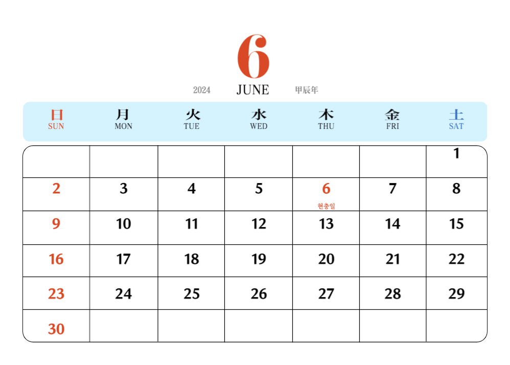◆ 2024년 6월 공휴일은 6월 6일 현충일입니다. 7일(금) 휴가를 사용한다면 4일 휴일이 가능합니다.