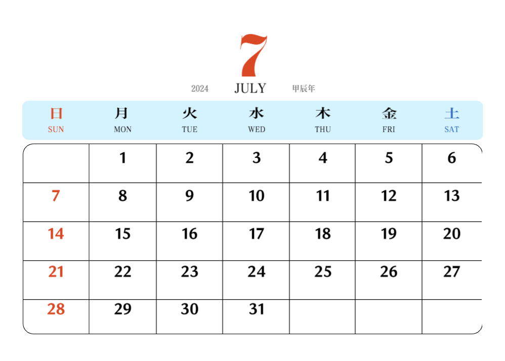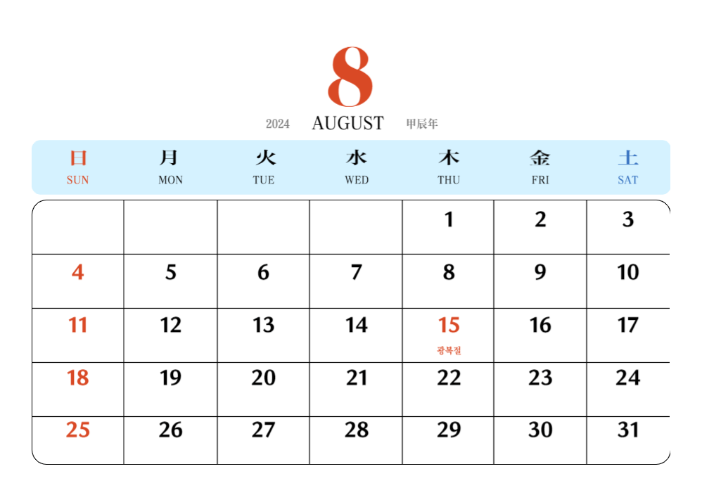 ◆ 2024년 7월은 아쉽게도 공휴일이 없습니다. 빠른 학교의 경우, 7월 말부터 여름방학이니 미리 여름휴가 계획을 세우셔야 하겠네요.