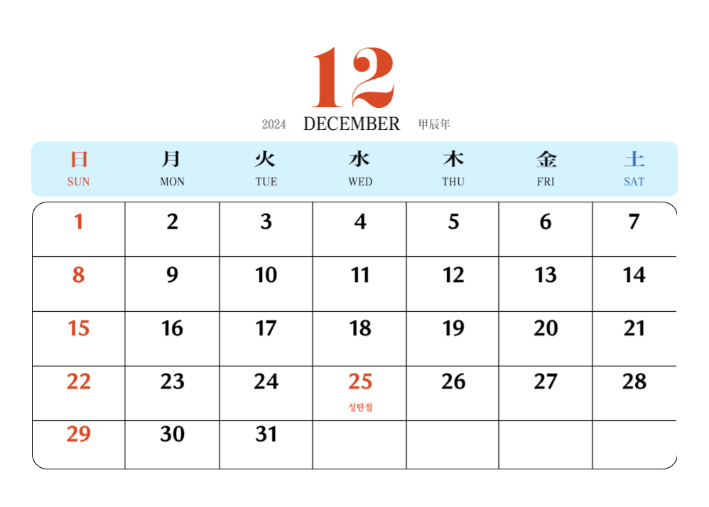 ◆ 마지막으로 2024년 12월 공휴일은 25일 성탄절입니다. 남은 휴가가 많이 있다면 앞 뒤로 이틀 휴가를 사용하시면 5일 휴일을 보낼 수 있습니다.