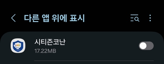 ③ 다른 앱 위에 표시도 권한을 부여해줍니다. 오른쪽으로 이동시켜 활성화 시켜줍니다.