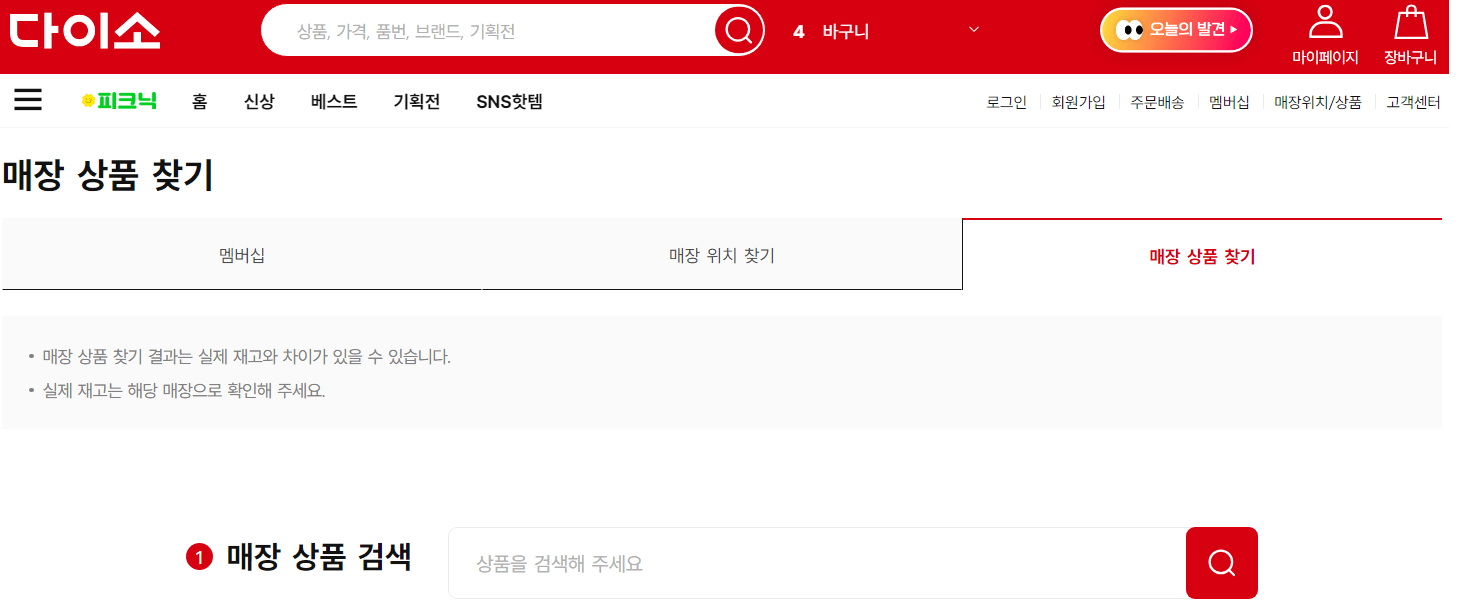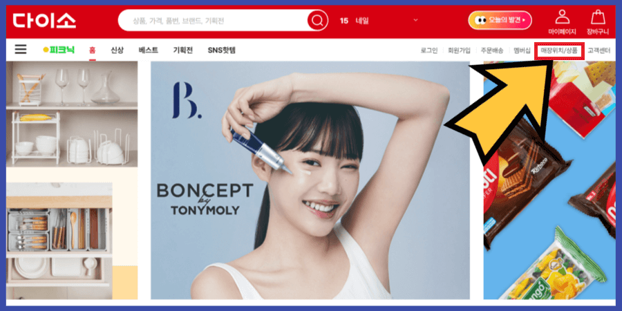 ① 다이소 홈페이지 좌측 상단, "매장위치/상품"을 클릭합니다.