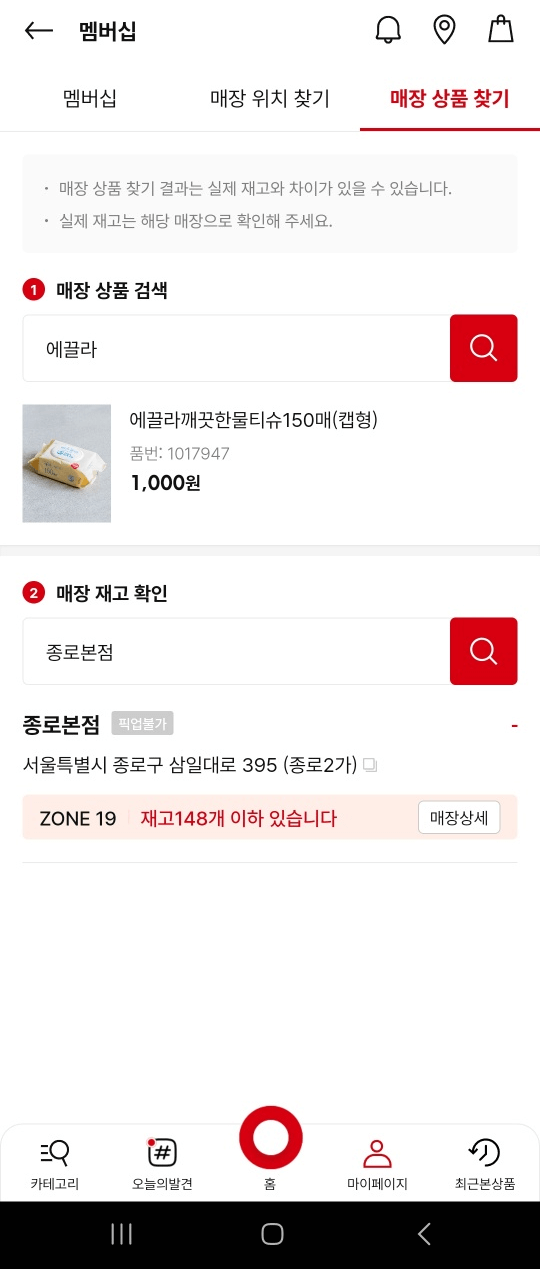 ③ 상품입력 후 방문하고자 하는 매장정보를 입력하고 재고유무를 확인합니다.