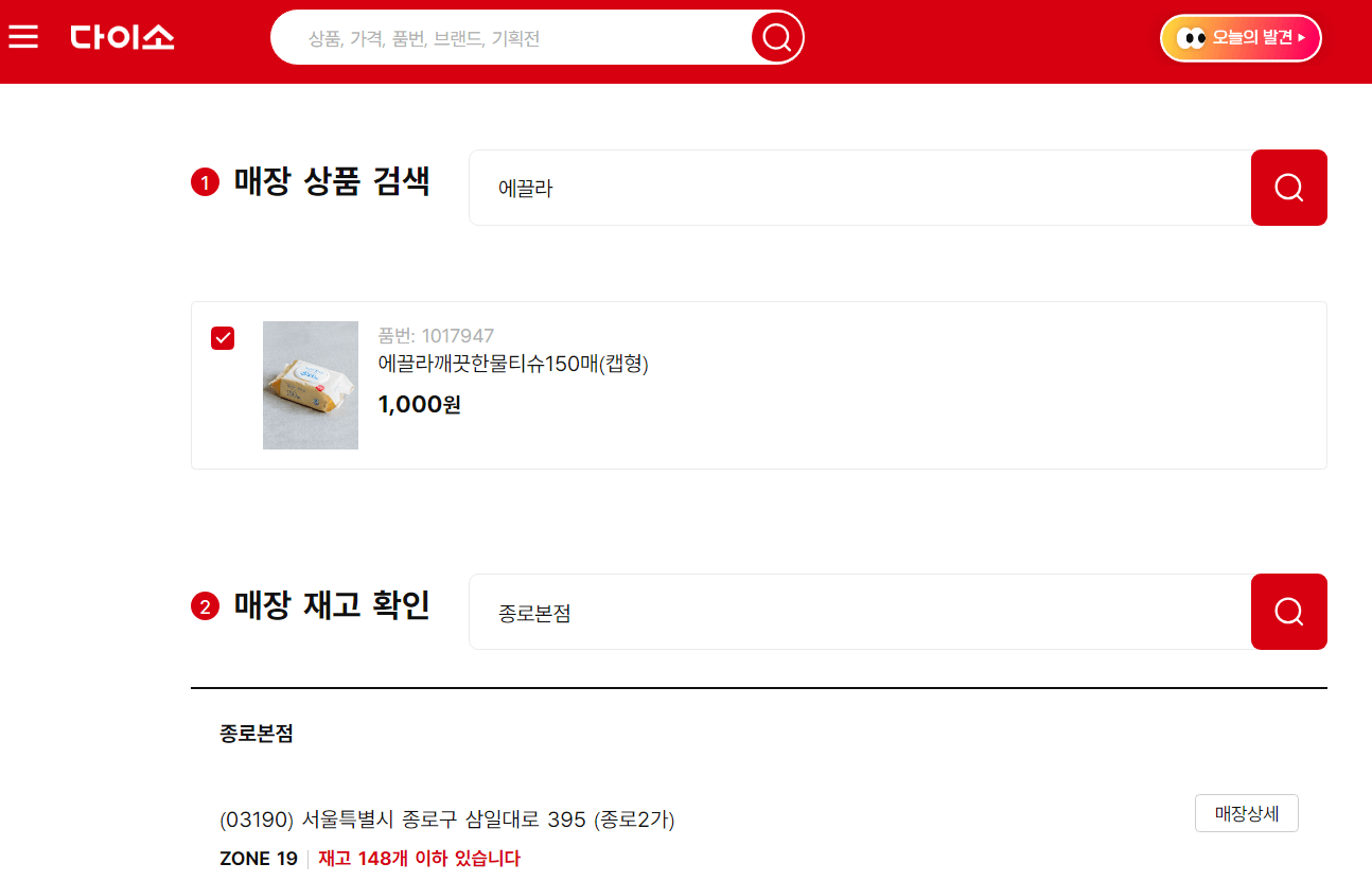 일반상품의 경우, 재고가 충분히 있으나 인기 상품의 경우는 매장 사정에 따라 재고가 없는 경우가 빈번하게 일어납니다. 다이소 매장 방문하기 전에 재고 유무를 확인 후 방문하시면 시간을 충분히 절약하실 수 있습니다.