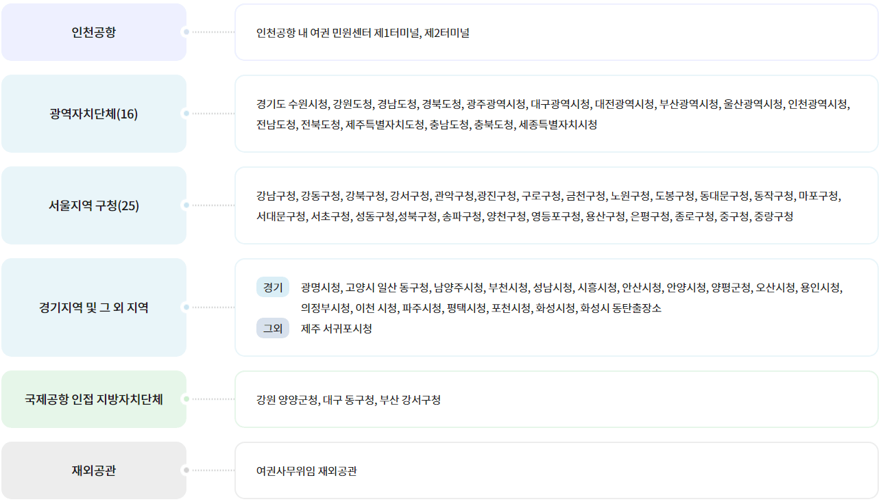 ✅ 인천공항, 광역자치단체(16), 서울지역 구청(25), 경기지역 및 그외 지역, 국제공항 인접 지방자치단체