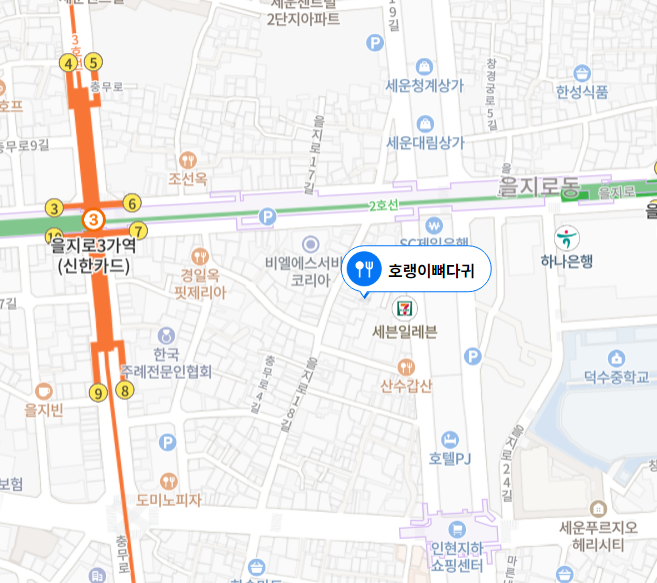 위치가 좀 애매하지만 을지로 3가, 4가 역 사이인데 PJ(풍전) 호텔 옆으로 보면 된다.