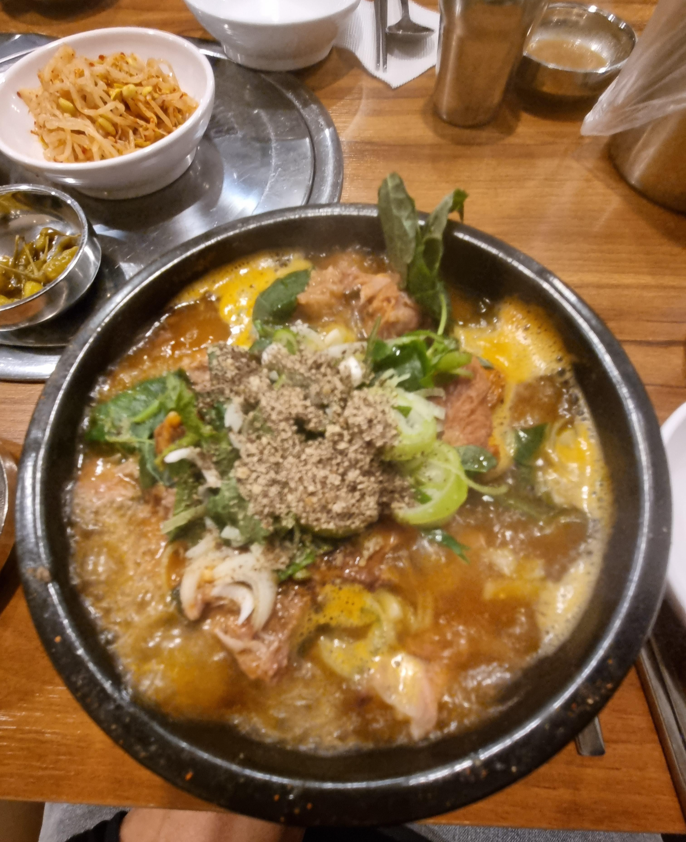 깻잎에 들깨가루가 뿌려져 아주 팔팔 끊는 상태로 뼈다귀 해장국이 나왔다.