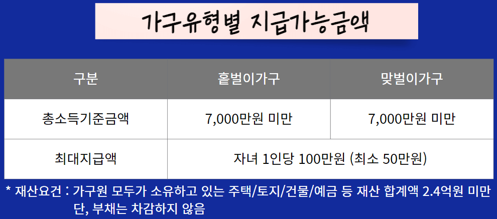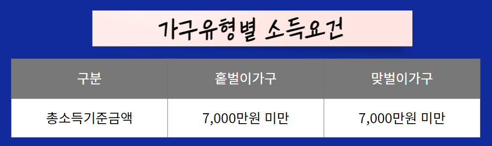 자녀장려금의 경우, 부부합산 연간 총소득기준금액 기준을 두고 있습니다. 그 조건에 충족해야 됩니다. 가구유형 구분없이 홑벌이 가구 또는 맞벌이가구 기준 7,000만원 미만이어야 합니다.