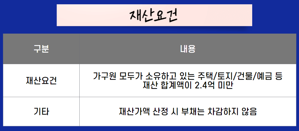 가구원 전체 기준으로 2.4억원 미만이어야 하며 주택,토지,건물,예금을 합산한 기준입니다. 다만 재산가액 산정 시 부채는 차감하지 않고 산정합니다.