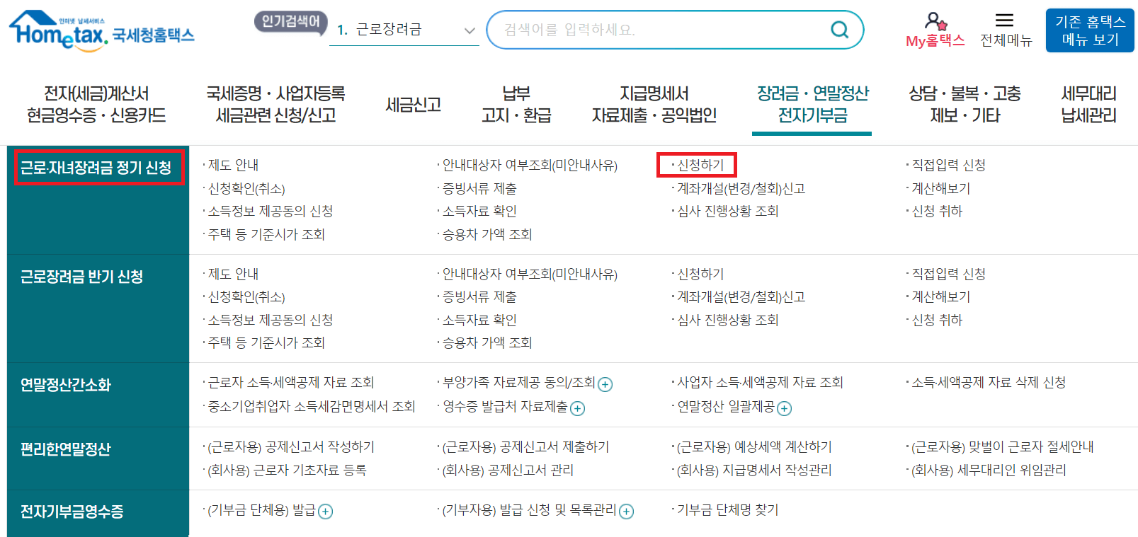 ※ 홈택스 방문시, "장려금/연말정산 전자기부금" 메뉴에서 자녀장려금을 신청하시는데 정기와 반기를 구분하여 꼭 신청하셔야 합니다.