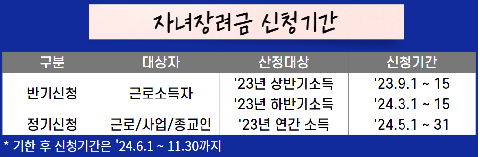 자녀장려금은 반기, 정기신청이 가능합니다. 반기신청의 경우는 근로소득자만 해당합니다.
