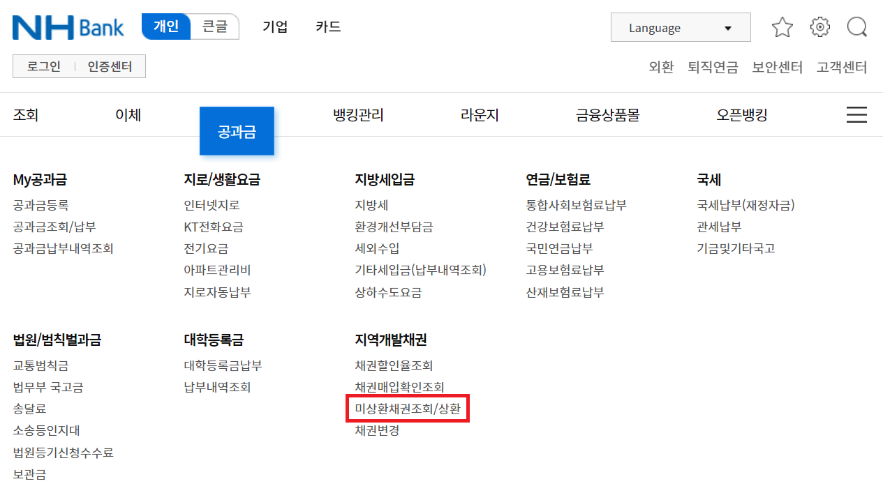 ② 농협은행의 경우, 홈페이지 로그인 후 > 공과금 > 미상환채권조회/상환 경로로 신청하시면 됩니다.