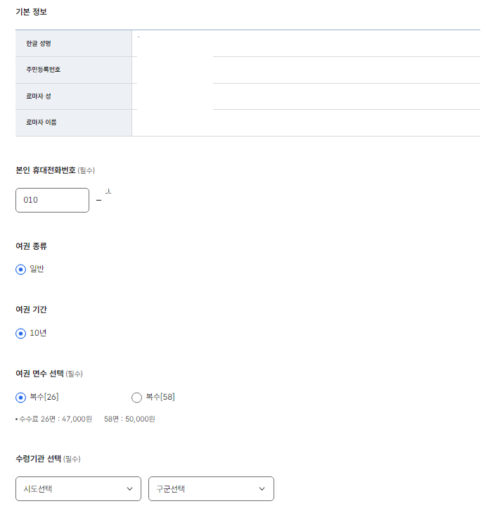 6️⃣ 기본정보, 재발급 여권정보, 수령기관을 선택합니다.