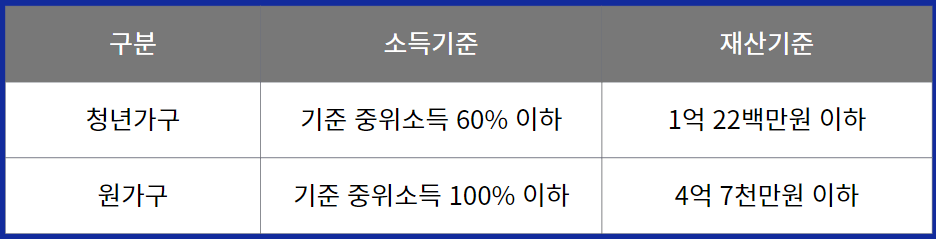 "청년 원가구"의 소득이 기준 중위소득 100% 이하이면서 "청년가구" 소득이 기준 중위소득 60% 이하