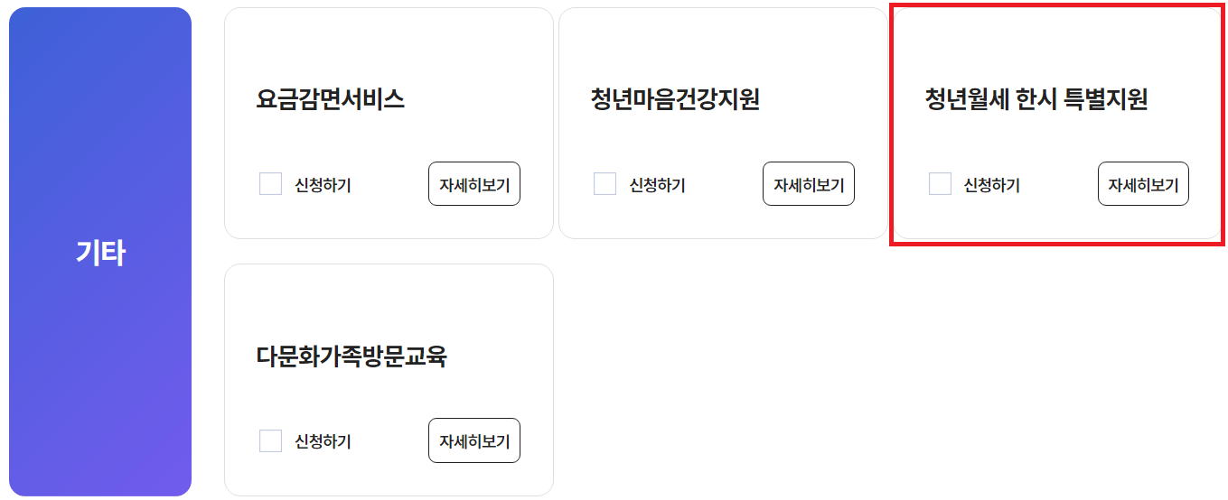 복지로 홈페이지 → 서비스신청 → 간편인증 → 하단(기타)의 "청년월세 한시 특별지원" 신청하기
