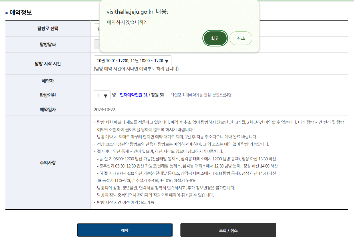 한라산 탐방예약 관련 주의사항