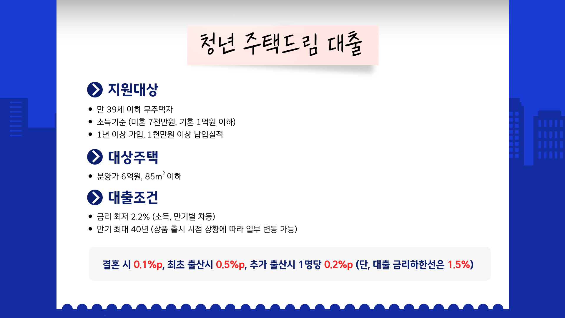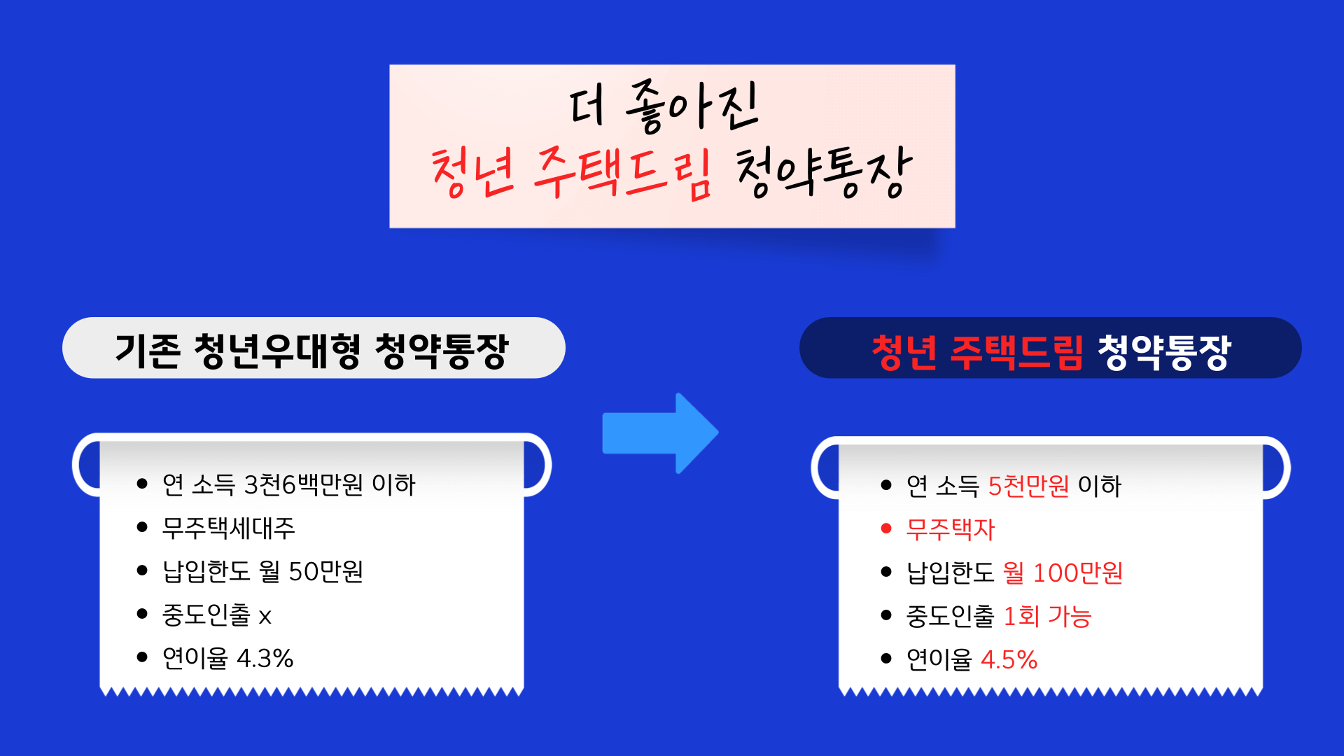 * "청년 주택드림 청약통장’(만 19~34세 무주택자)은 현행 청년 우대형 청약통장 대비 완화된 가입요건(소득 3,600 → 5천만원, 무주택 세대주→무주택자), 높은 이자율(최대 4.3 → 4.5%)과 납입한도(최대 50 → 100만원)를 적용함으로써 자산형성을 뒷받침하면서 청약 기회도 제공합니다.