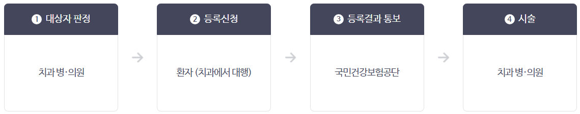 치과 병의원에서 진료 후, 치과임플란트 급여대상자를 판정하며 치과에서 환자 등록신청을 대행하므로 별도로 신청하실 필요 없습니다.